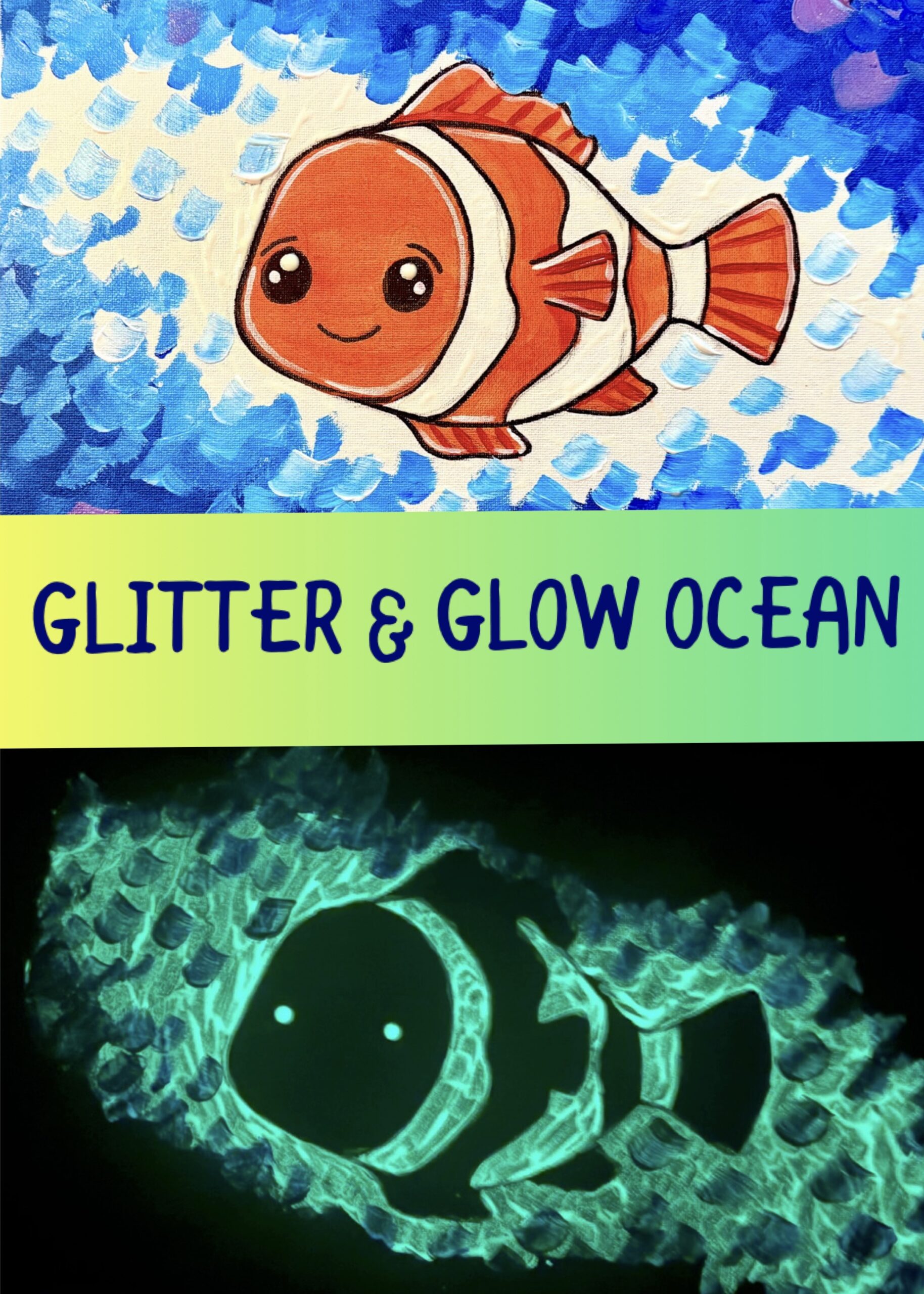 A brand new art camp theme is coming to Paint It KIDS Studio this summer… Glitter & GLOW Ocean! This camp not only features four amazing ocean animals, but all of our paintings will be painted with glow-in-the-dark paint, embellished with glitter, jewels and/or metallic paint! Learn to draw & paint a glowing clown fish, glittering sea turtle and so much more! Painting with Miss Kate is easy & fun with our simple step-by-step instructions! This camp is perfect for all artists ages 5 & up!