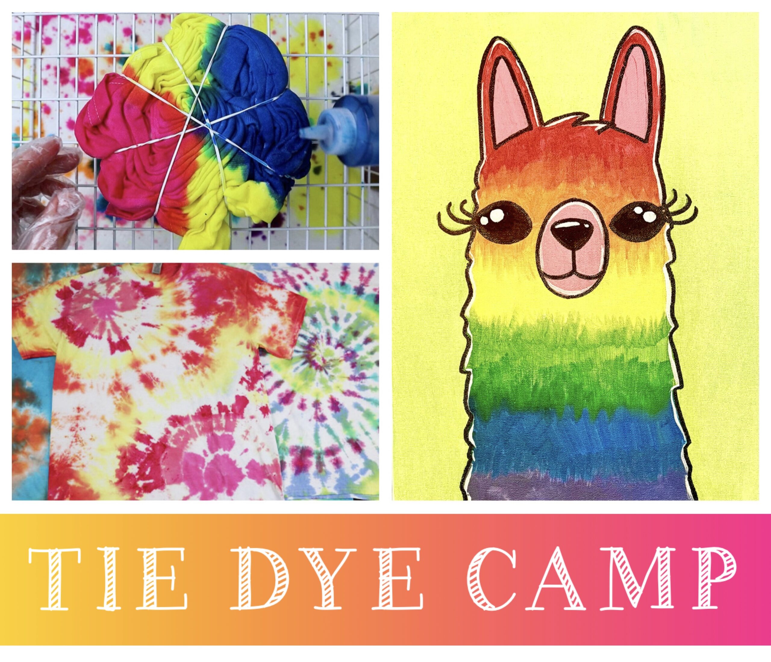 Miss Kate is bringing back out most popular art camp from last summer…. and it is all about TIE DYE! If you love Tie Dye and all things RAINBOW you will love our Tie Dye week, and this summer we have four brand new paintings! Each camp day will feature an animal of the day that we will paint with acrylic paint on canvas, and also a Tie Dye craft! We will learn to mix all of our colors from red, yellow and blue as we paint a fun tie dye llama, an adorable hamster wearing a tie dye shirt and so much more! We will also learn to tie dye with four fun crafts… a tie dye t-shirt, tote bag, handkerchief & more! This camp is great for artists of all ages 5 & up!